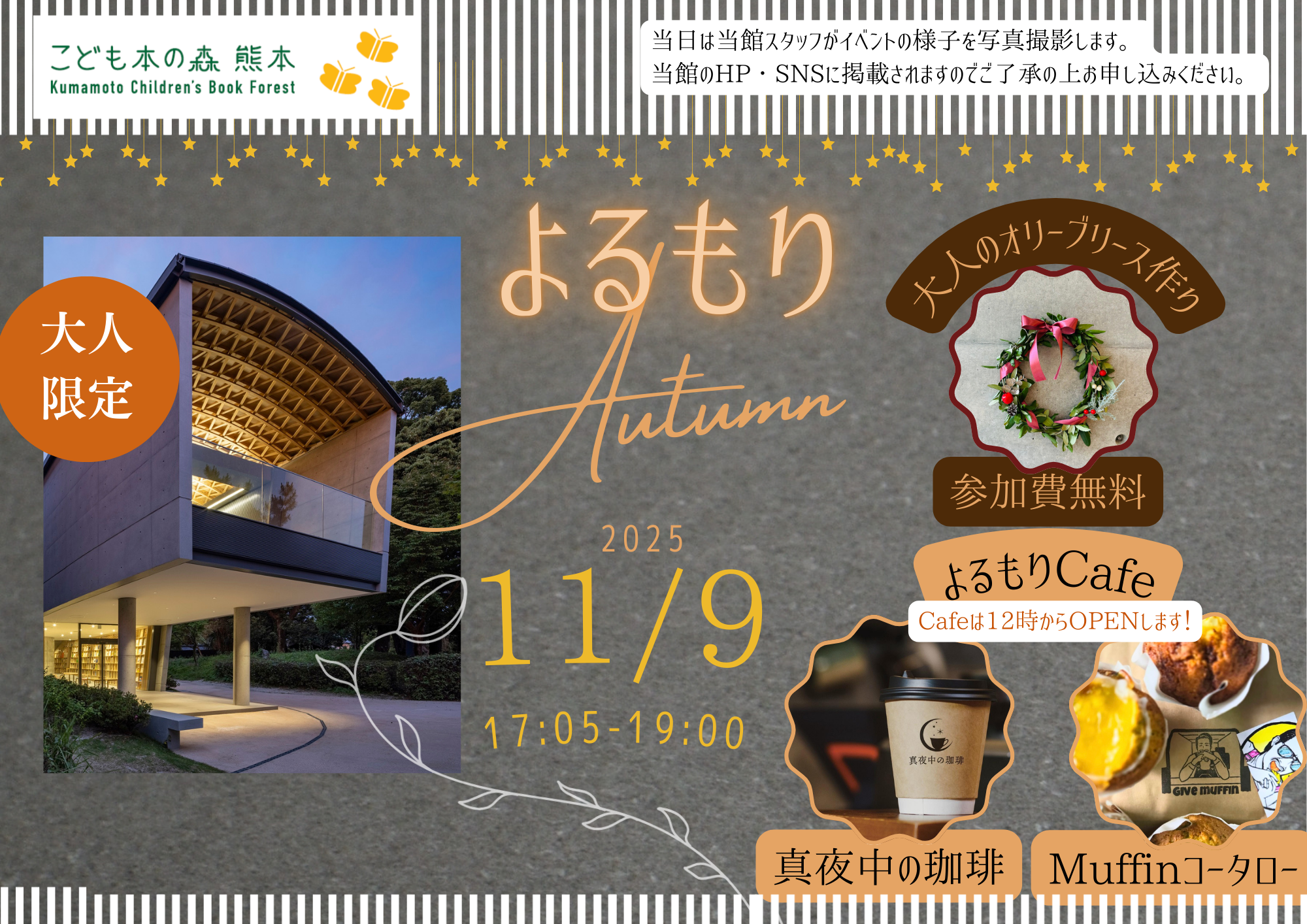 備考 | オリーブリース作り以外の時間は17:05~19:00までよるもりCaféをお楽しみいただけます。 ※よるもりCafe分が売り切れ次第Caféを早めに終了する場合がございます。 【よるもりCafe 出店者】 丁寧に至福の一杯を味わえる『真夜中の珈琲』さん 様々な味が楽しめる絶品のマフィン屋さん『Muffinコータロー』さん ※飲食はウッドデッキコーナーのみでお願いします。 |