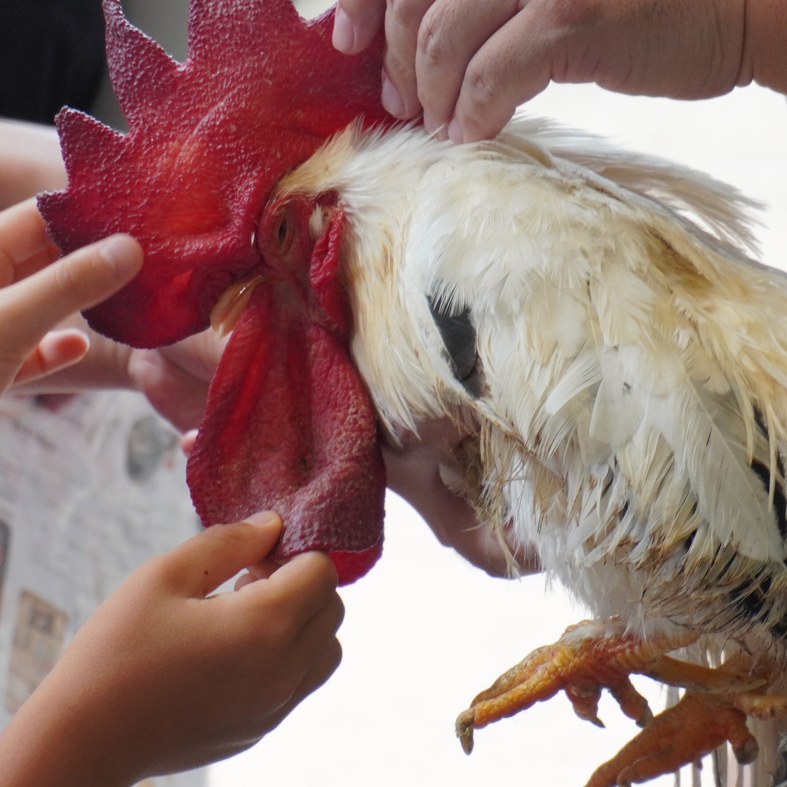 講演のあと、1階テラスで獣医さんからペットゲストのチャボのお話を聞き、実際に触れたり撫でたりと子どもたちにとても人気でした。
