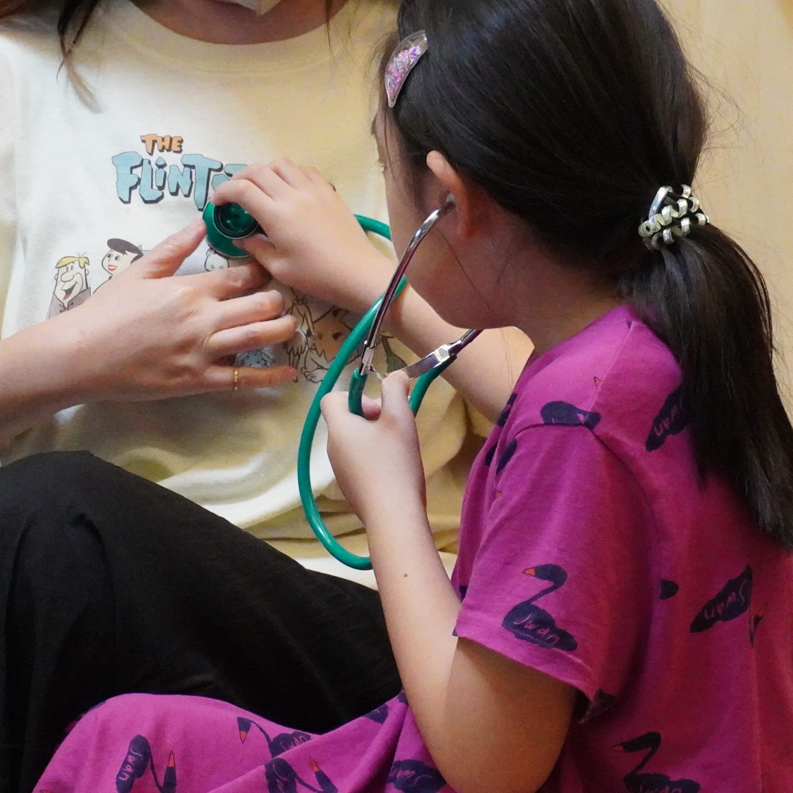 今回は、アニマルフレンズ熊本(熊本県動物愛護センター)さんを招いてお話をしていただきました。お話は50分程で、子どもたちは張り子の動物を使い環境の住み分けを学んだり、聴診器をそれぞれの胸やお腹にあてて音を聴いたりして、いのちの大切さを考えてもらえたようです。また、参加者に同伴していた赤ちゃんの心音をスピーカーで流される場面もありました。お腹の中にいた時の胎動音と重なり子どもも大人も静かに聞かれていました。講演後半では、ケージに入った犬の絵を見ながら、犬の気持ちをホワイトボードに書いて子どもたちが発表。動物の気持ちに寄り添うことを考えてくれました。