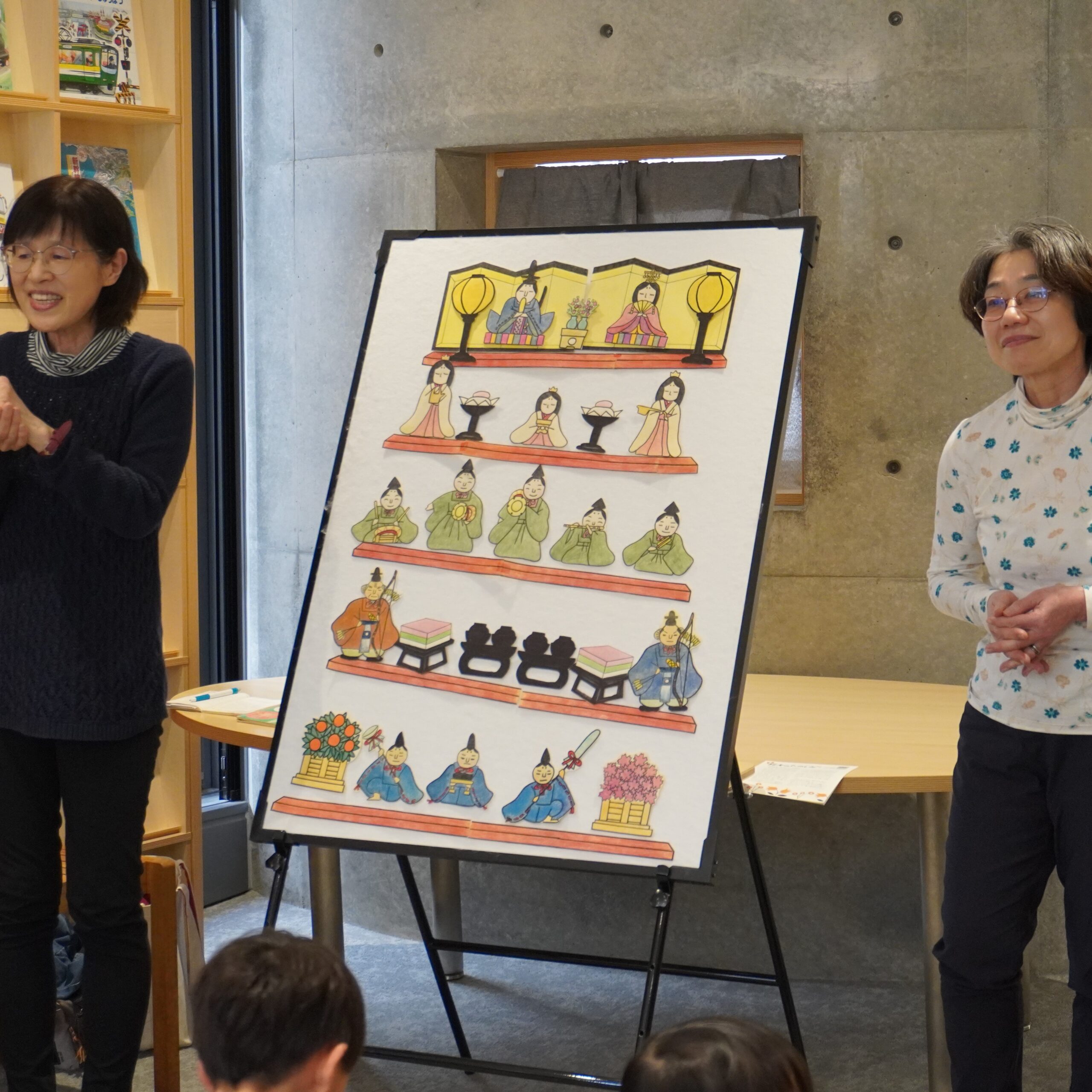 また、ひな祭り直前ということで、パネルシアターで「うれしいひなまつり」も楽しみました。歌声に合わせてお内裏様やお雛様、三人官女が次々と登場し、あっという間に華やかな雛壇が出来上がりました。歌詞にまつわるエピソードには、大人の方々も懐かしい歌の背景に興味深く耳を傾けていらっしゃいました。