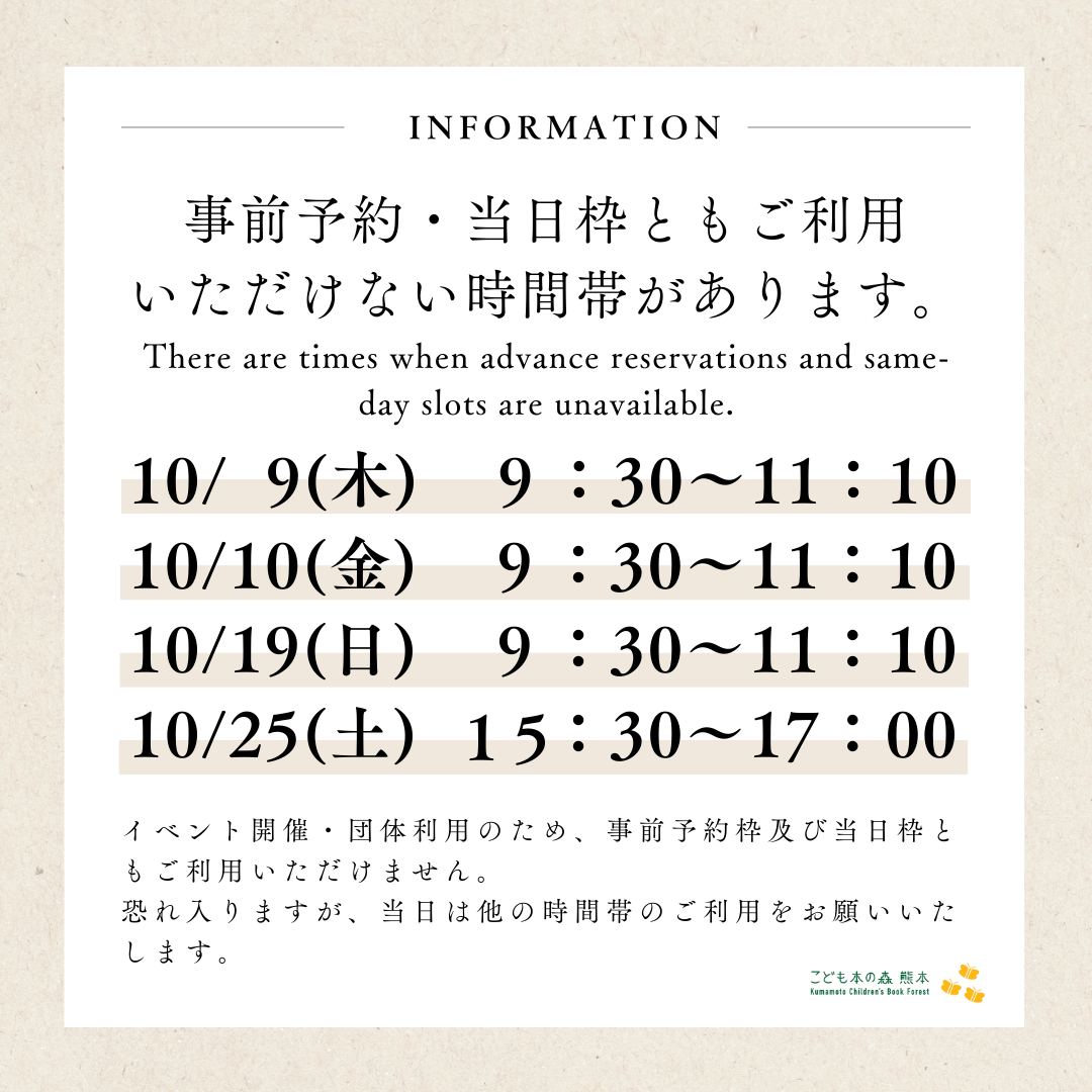 [10/9(木)・10(金)・19(日)・25日(土)]事前予約・当日枠ともご利用いただけない時間帯があります