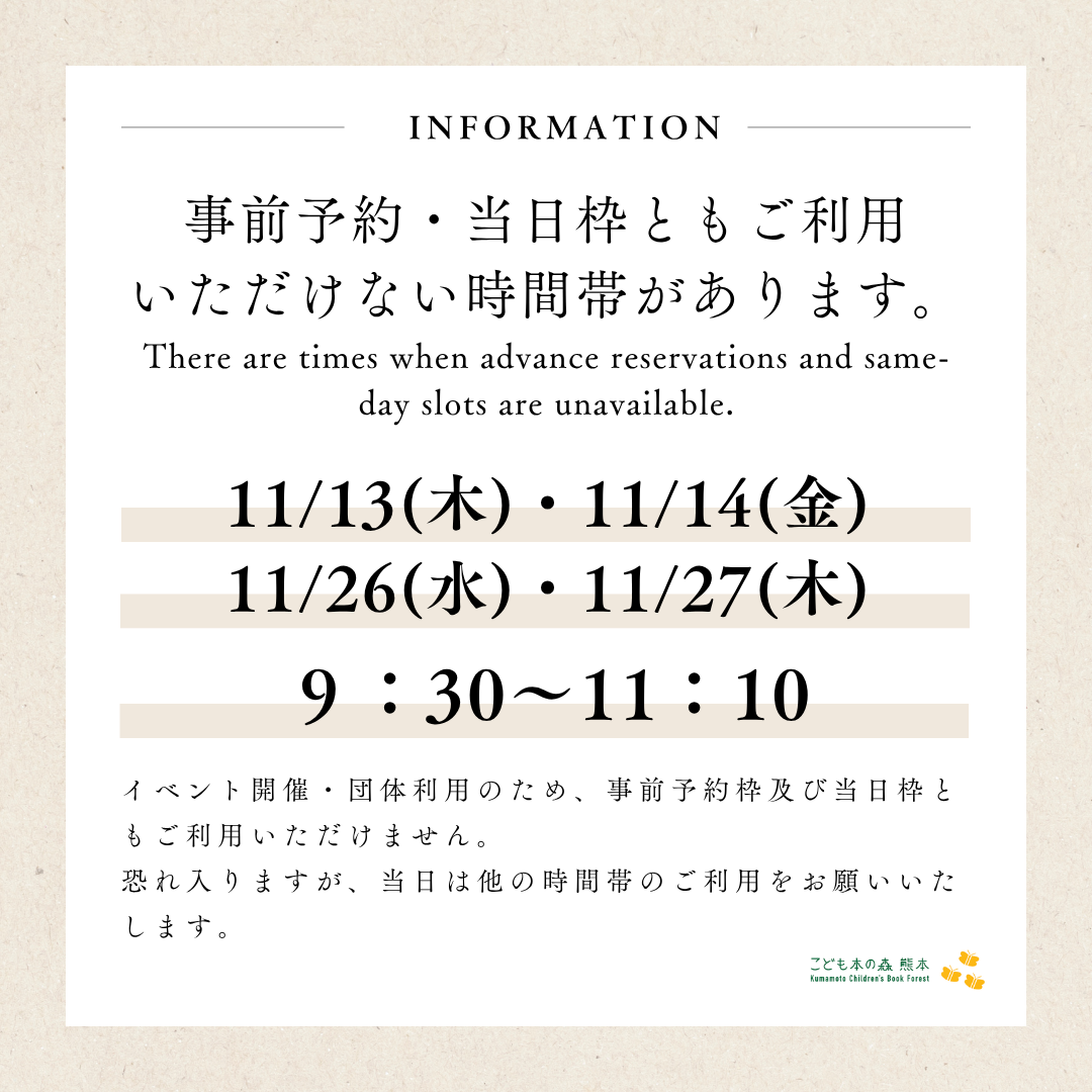 [11/13(木)・14(金)・26(水)・27(木)]事前予約・当日枠ともご利用いただけない時間帯があります