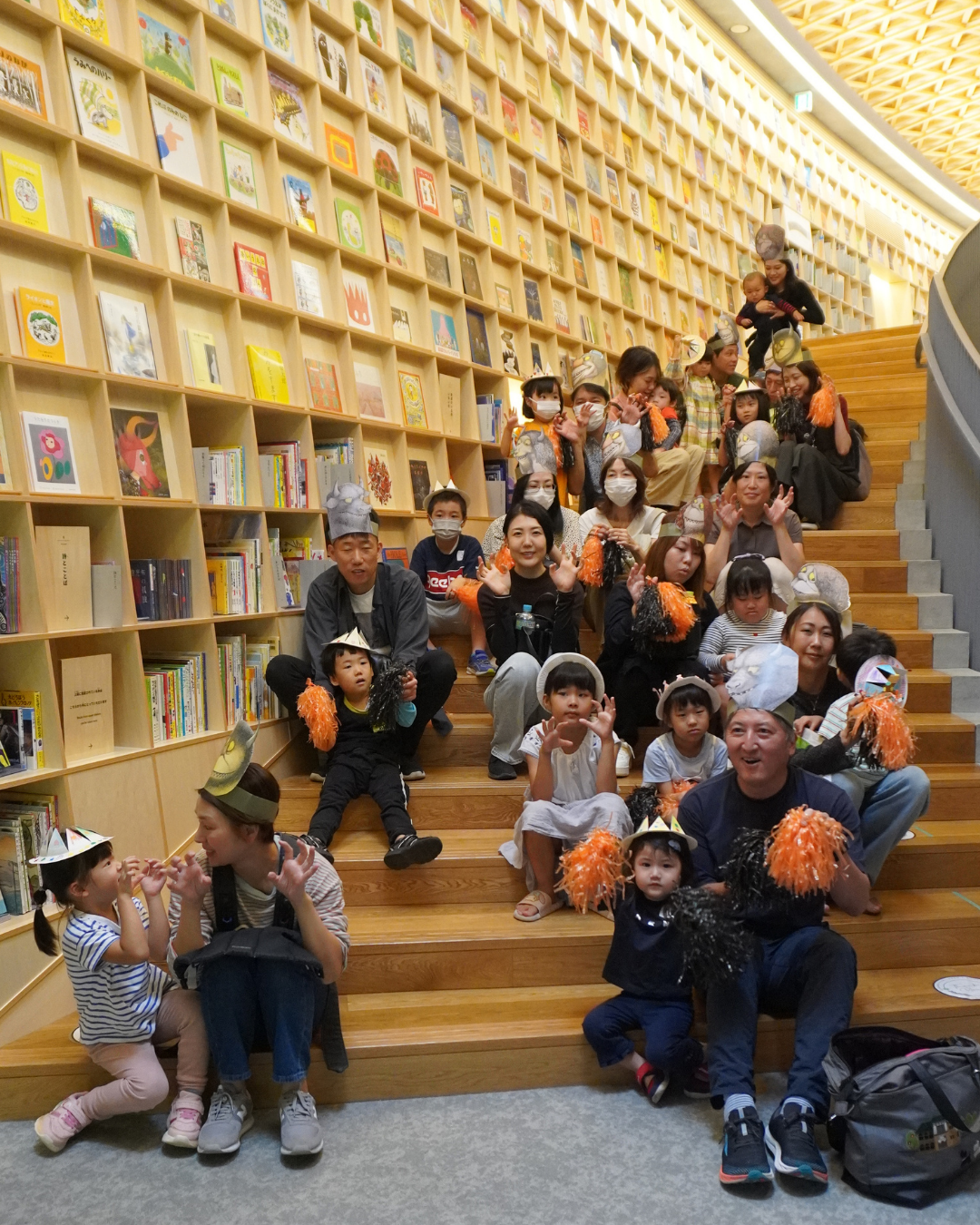 “かいじゅうおどり”でかいじゅうたちのように「うおーっ」と声を出しながら、絵本の世界を体いっぱい楽しむ子どもたちの姿と、少し恥ずかしそうにお面をかぶって楽しまれているご家族の姿がとても印象的でした。