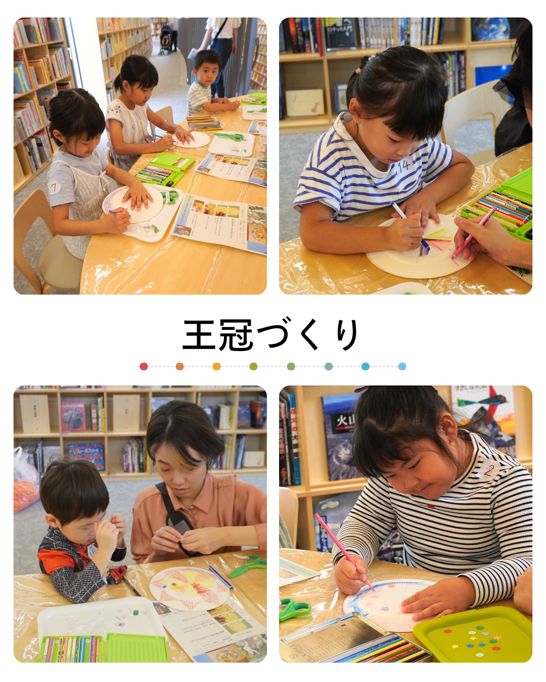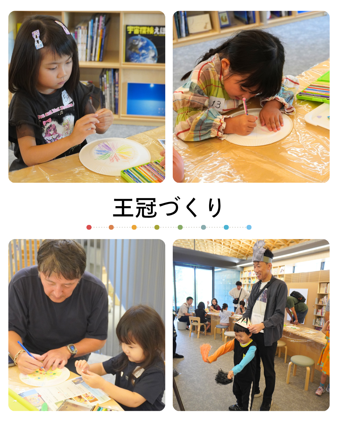 子どもたちには、主人公マックスの王冠を紙皿で作成してもらいました。ご家族の方には、絵本の中にでてくる“かいじゅうたち”のお面をかぶってもらい、おはなしの世界をとびだし、絵本の世界をみんなで体験しました。