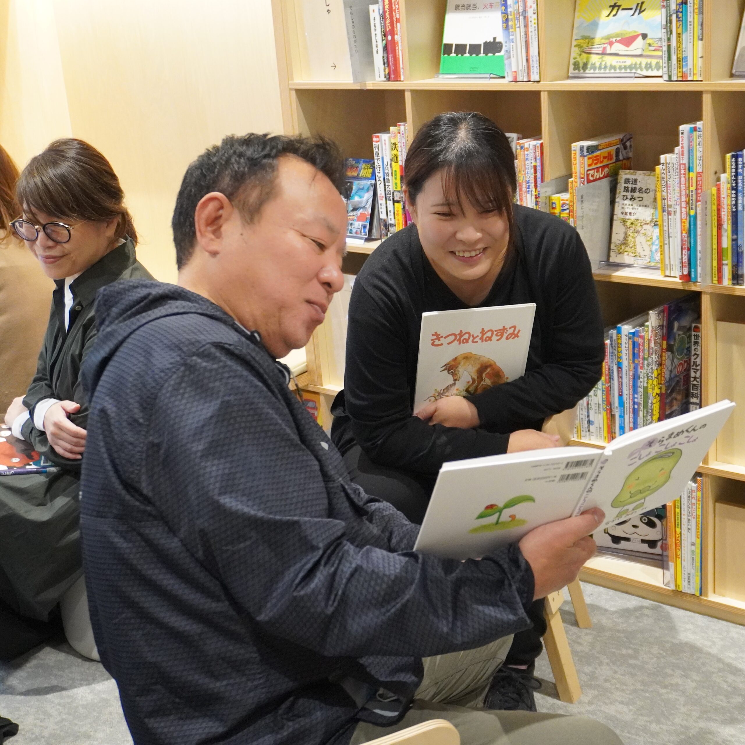 後半には、絵本『ぞうくんのさんぽ』を使って、登場人物の声色を変えた絵本の読み方をレクチャーされました。その後参加者の皆さんにも、思い思いの絵本を選んでもらい、ペアを作ってよみきかせ体験をしていただきました。