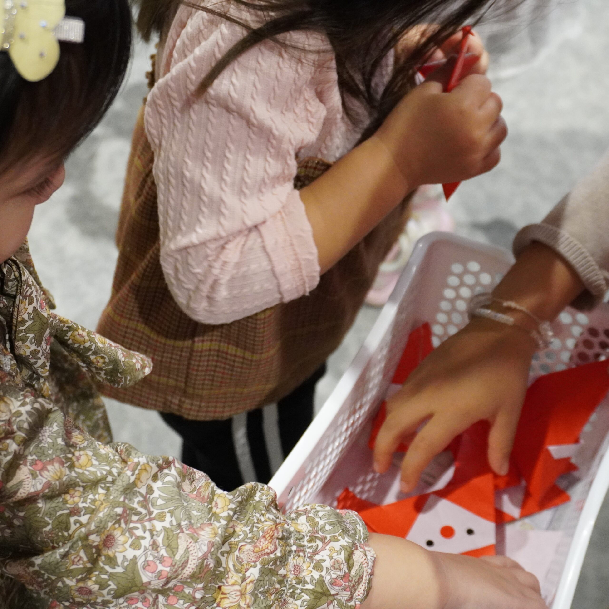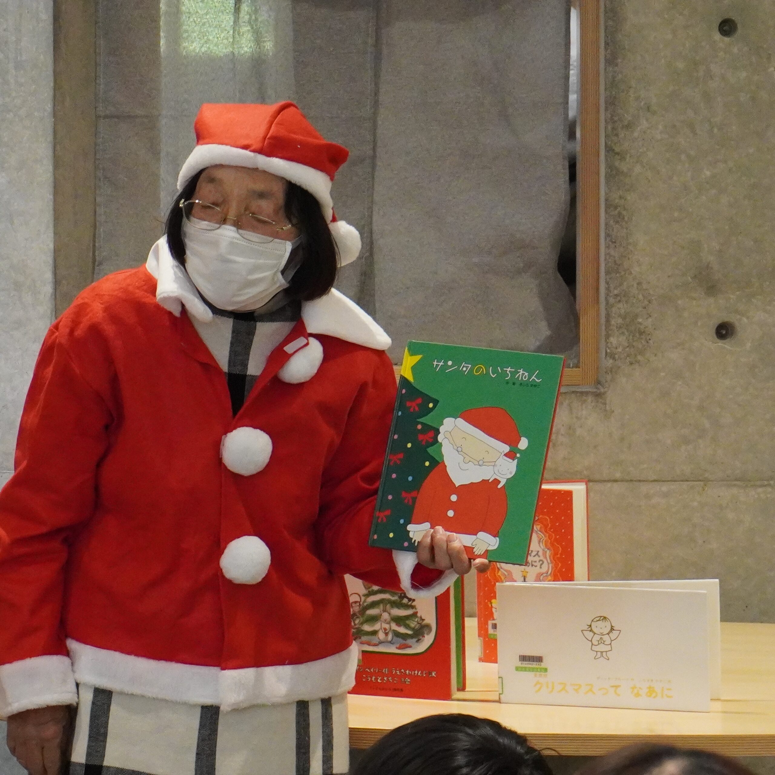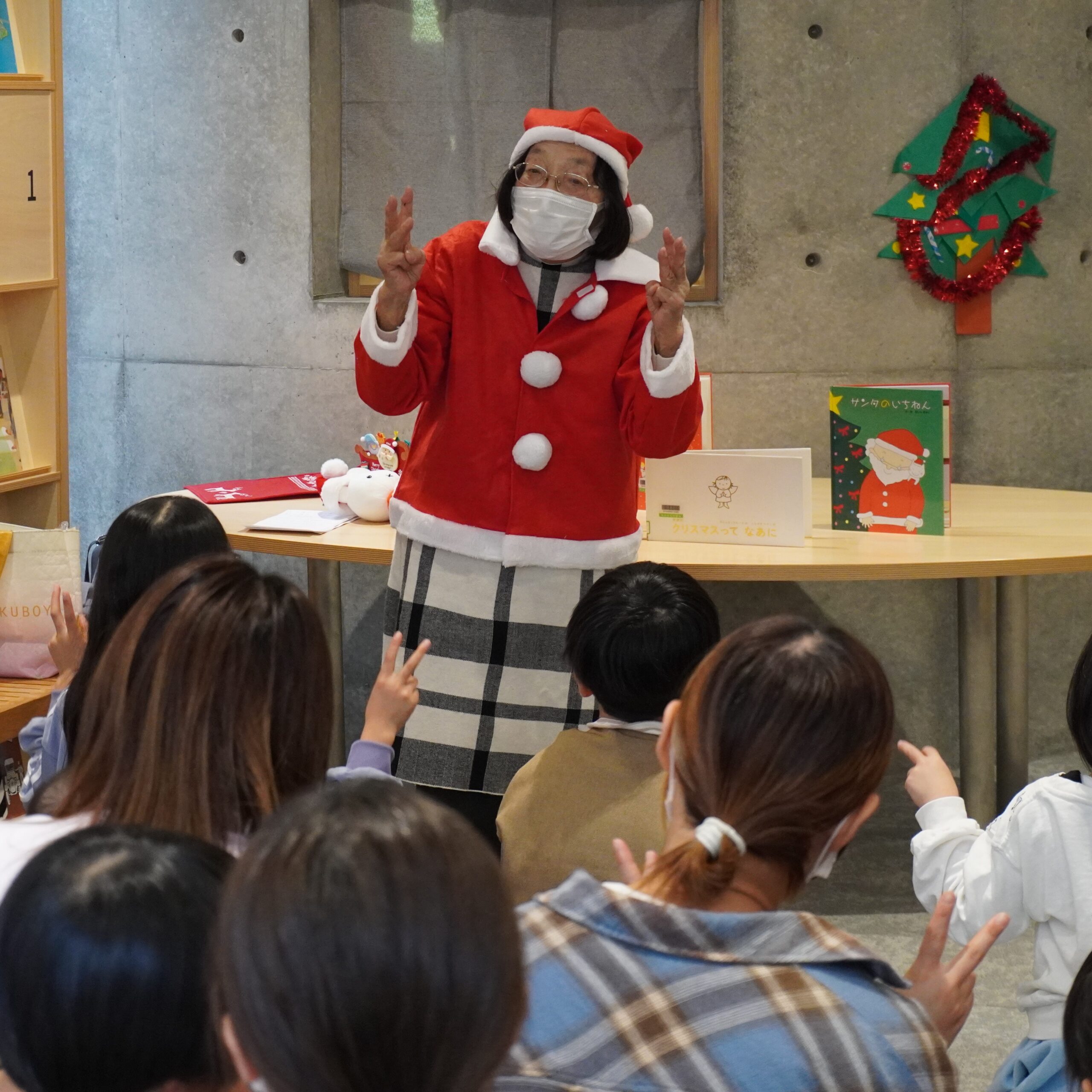 続いての『サンタのいちねん トナカイのいちねん』では表紙からも裏表紙からも読める不思議な仕掛けに、子どもたちもびっくり!手遊び「いっぽんろうそく ツリーにおかざり」で、みんなで手を叩き、サンタさんを呼ぶ楽しいひとときを過ごしました。そして会の最後には、お正月に向けた「ねずみのもちつき」のストーリーテリングでクリスマスからお正月へと、季節が移り変わる高揚感を感じられる締めくくりとなりました。