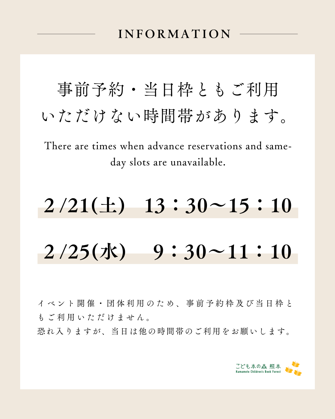 [2/21(土)・25(水)]事前予約・当日枠ともご利用いただけない時間帯があります