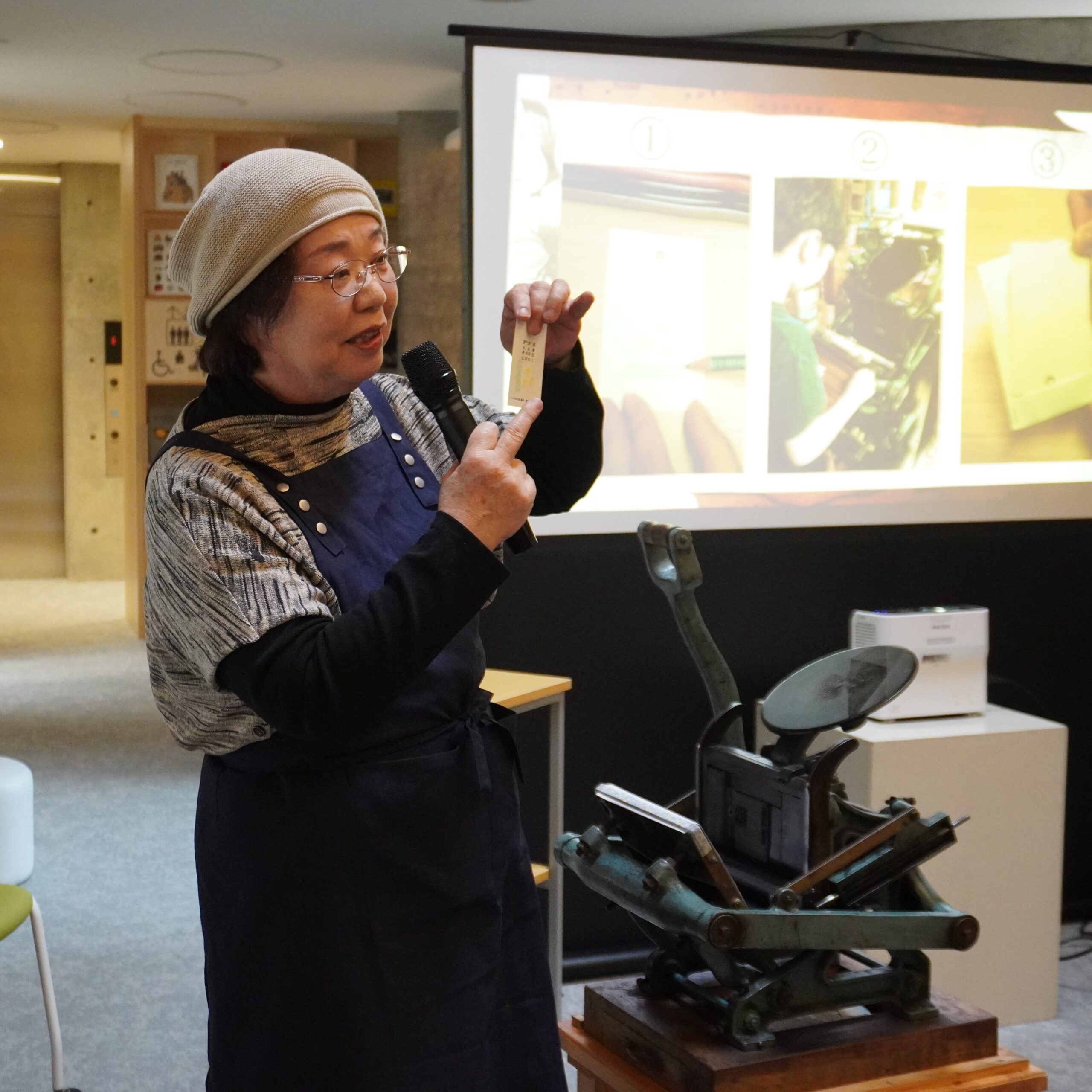本イベントでは、御船町で活版印刷所を営んでいる吉田典子さんを講師に迎えて、当館オリジナルのしおり作りを行いました。