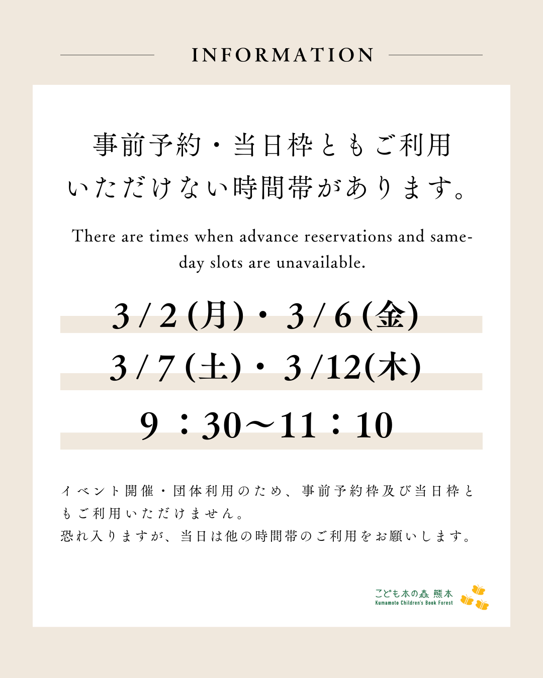 [3・2(月)・6(金)・7(土)・12(木)]事前予約・当日枠ともご利用いただけない時間帯があります