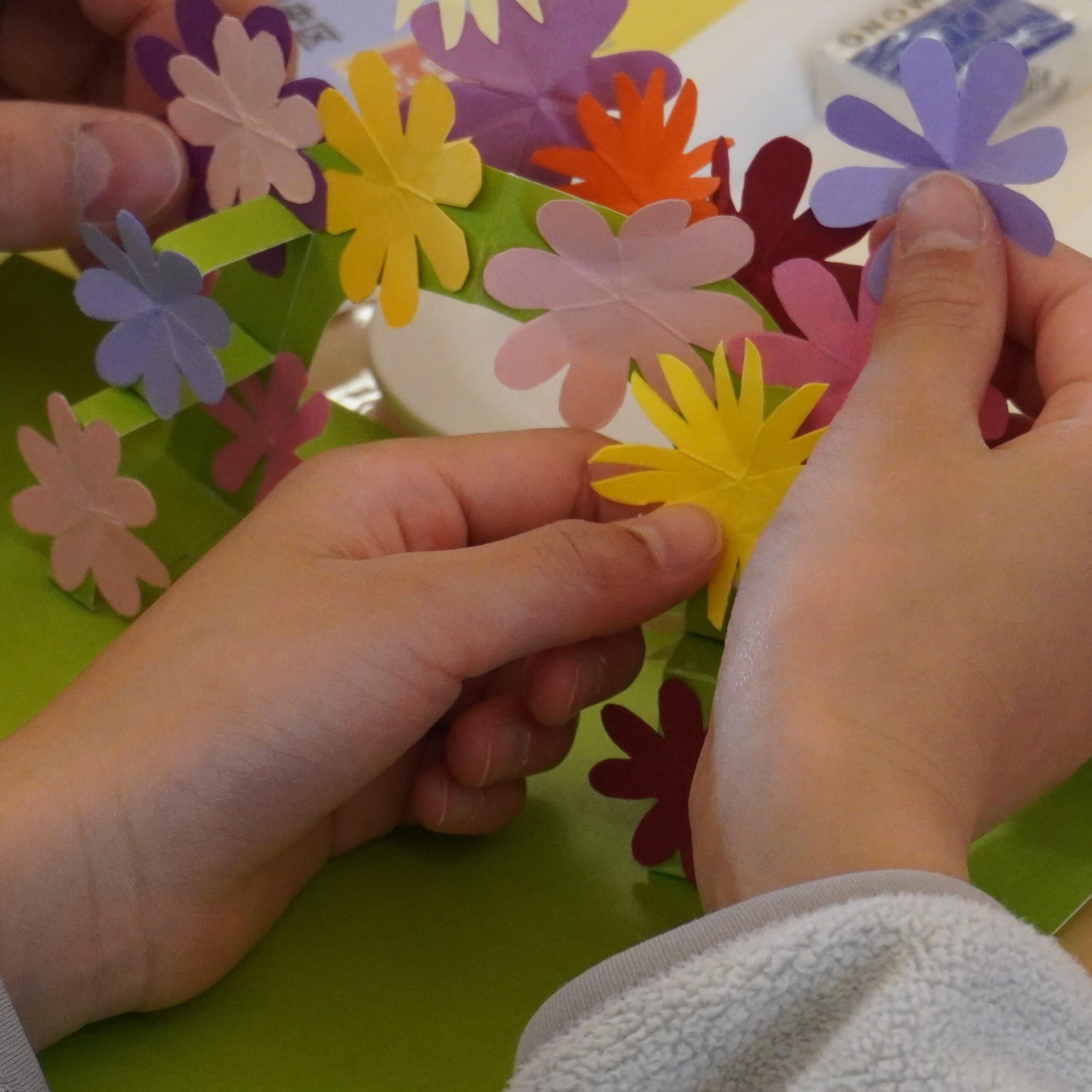 初めに、森人が作った「手紙ってどんなもの?」をスライドで見て、手紙の魅力に触れ、ワクワクした気持ちを胸に、ワークショップがスタート。子どもたちの自由な発想で、オリジナリティあふれる、花束のようなポップアップカードが出来上がりました。